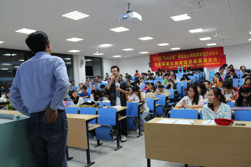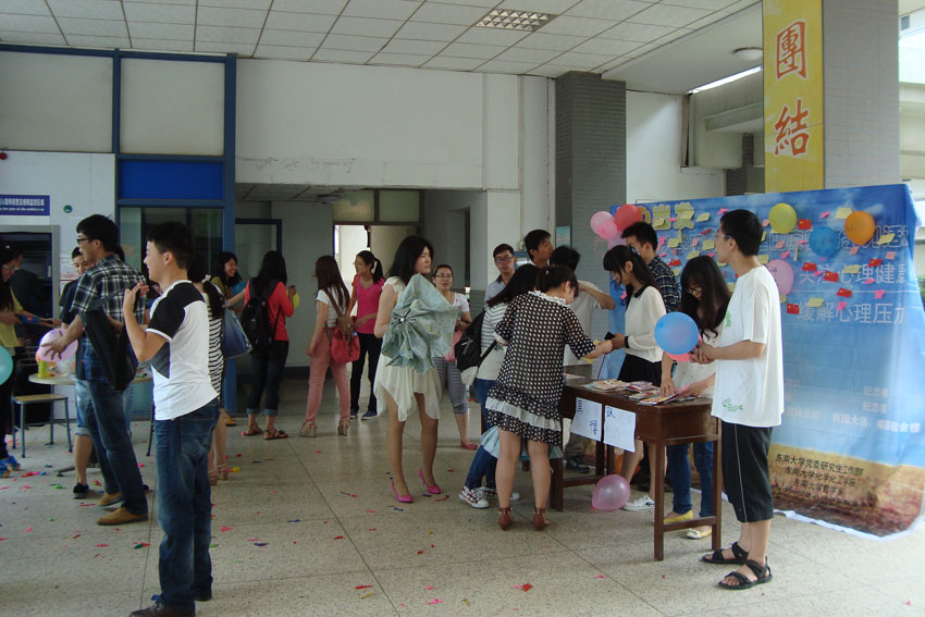 心理健康协会承办,旨在引导学生关注心理健康,培养积极心理,促进心智成熟。 本次心理健康活动以“关注心理健康 缓解心理压力”为主题,活动主要分为三个部分。 5月8日,我们在纪忠楼成功举办了心理测试活动。我们有幸邀请到了数学系党委副书记兼副系主任曹海燕老师、数学系团委书记袁煜昶老师、化学化工学院党委副书记兼副院长陆娟老师和化学化工学院团委书记梅震宇老师为嘉宾。本次活动主要分为心理知识简介和专业心理测试两个环节。首先主持人对抑郁自评量表(SDS)做了指导说明,同时介绍了抑郁焦虑存在的危害及问题,希望同学们高度重视自己的抑郁程度,及时调整自己。然后参加活动的学生认真填写了专业心理测试的问卷,并在主持人的指导下计算出自己的分数,根据分数等级了解自己的抑郁程度,及时的发现问题,解决问题。活动举办后反响热烈,为我们后期活动打下了坚实基础。 5月10日,我们有幸邀请到了中国药科大学郑爱民副教授在教学楼J2-209给大家上了一堂心理课,主题为“在压力下自由呼吸”。郑教授简单介绍了“WHO”身心健康的“三良标准”:良好的个性、良好的人际关系和良好的社会适应,然后重点讲了自我心理调节的三原则,现场同学和老师展开了激烈的讨论,郑教授也耐心的解答了同学们的疑惑与问题。两个小时的讲座,郑教授幽默风趣、知识渊博,赢得了同学们的阵阵掌声和喝彩,全场氛围热烈欢畅。 5月24日,我们在橘园大厅成功举办 525心理健康活动,主要通过两个游戏的方式来缓解学生的压力。第一个游戏是“战胜困难 释放心理压力”,具体的活动形式是:参加活动的同学将烦恼写在气球上,并使劲打气球,直到把气球打爆。该游戏的寓意是战胜困难,打倒烦恼。第二个游戏是“艺术表达 分享你我真情”,具体的活动形式是:参加活动的同学在便利贴上写下你的心情或困扰的问题或者是对他人的祝福,让其他的同学跟你一起分享或是帮你解决问题。该游戏的寓意是分享真情,共同承担。虽然今天酷暑难耐,但同学们积极参加,现场活动相当热烈! |