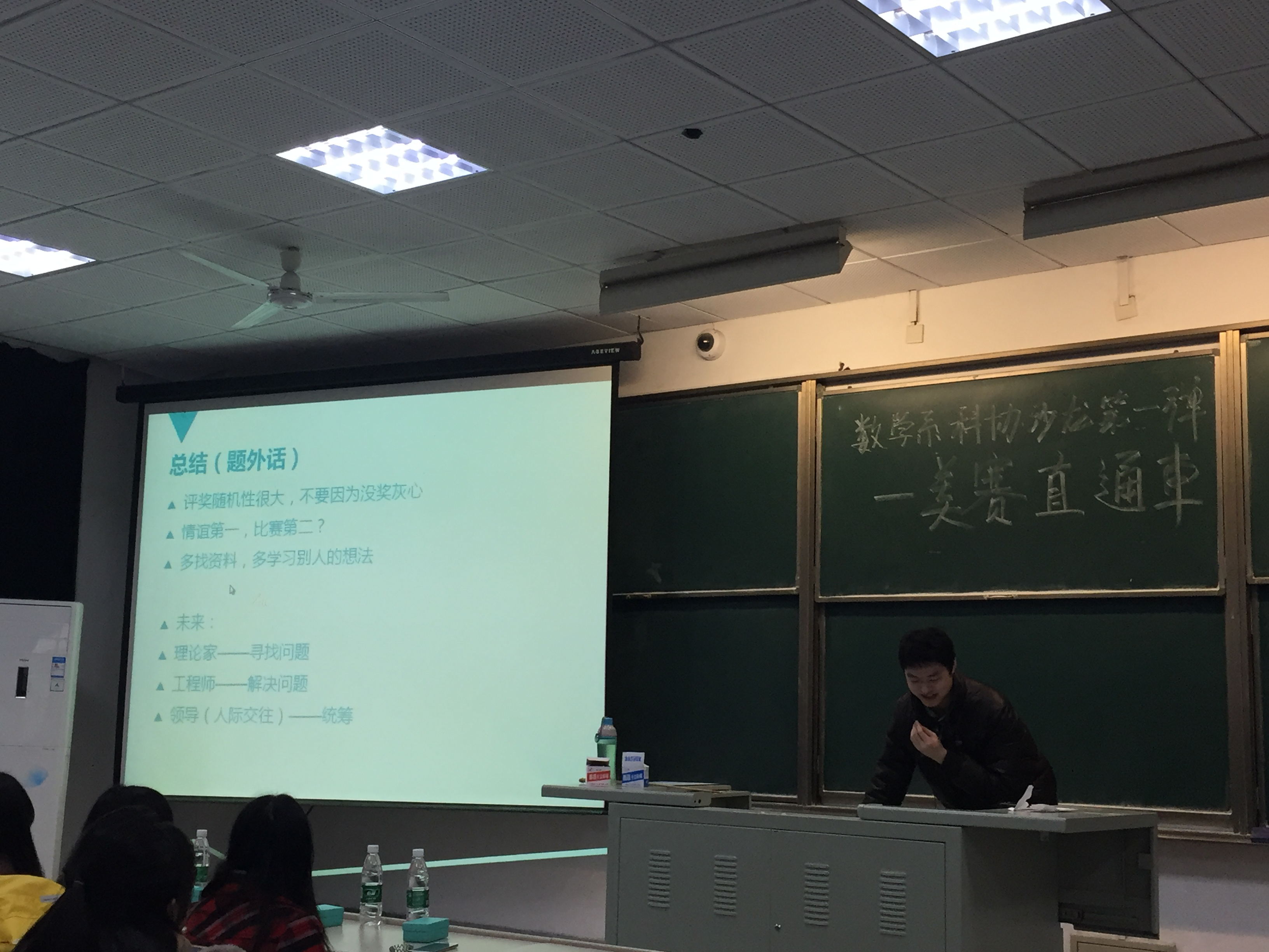 2015年12月23日中午,由数学系科技协会主办的沙龙第一弹――美赛直通车在教六-101成功举行,此次沙龙我们邀请到了在上届数模美赛中取得了优异成绩的学长和学姐们,为我们分享他们在比赛中的经验。