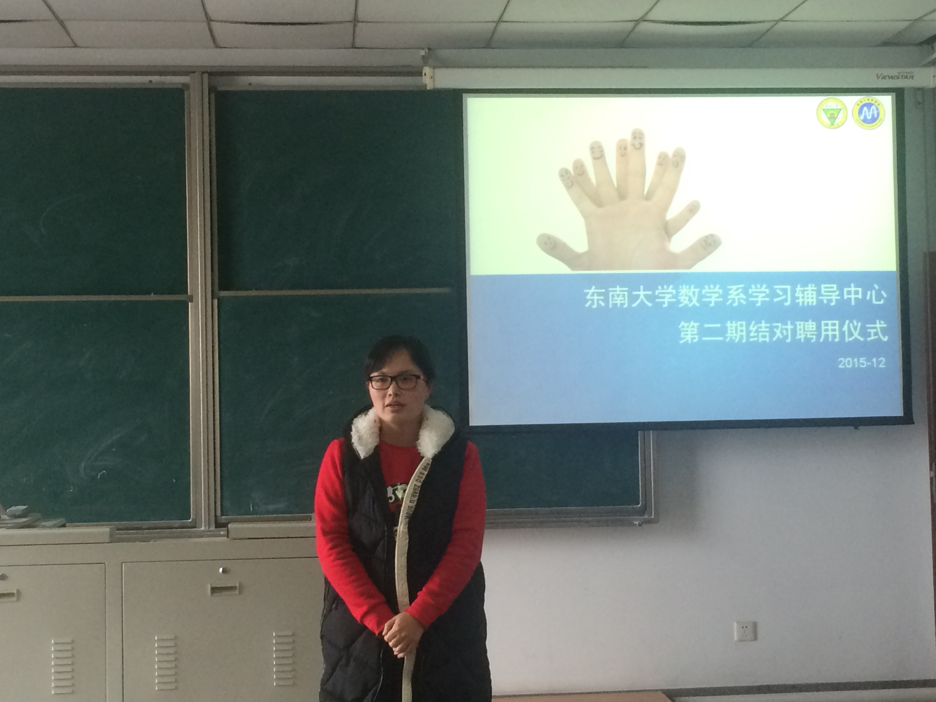 为了更好地促进我系2013级的学风建设,更好地架起学霸与学弱之间学习与情感的桥梁,数学系学习辅导中心第二期结对仪式于2015年12月24日圆满举行。数学系党委副书记曹海燕老师出席结对仪式,系团委书记、本科生第一党支部书记袁煜昶老师为13位辅导讲师颁发聘书和工作牌。