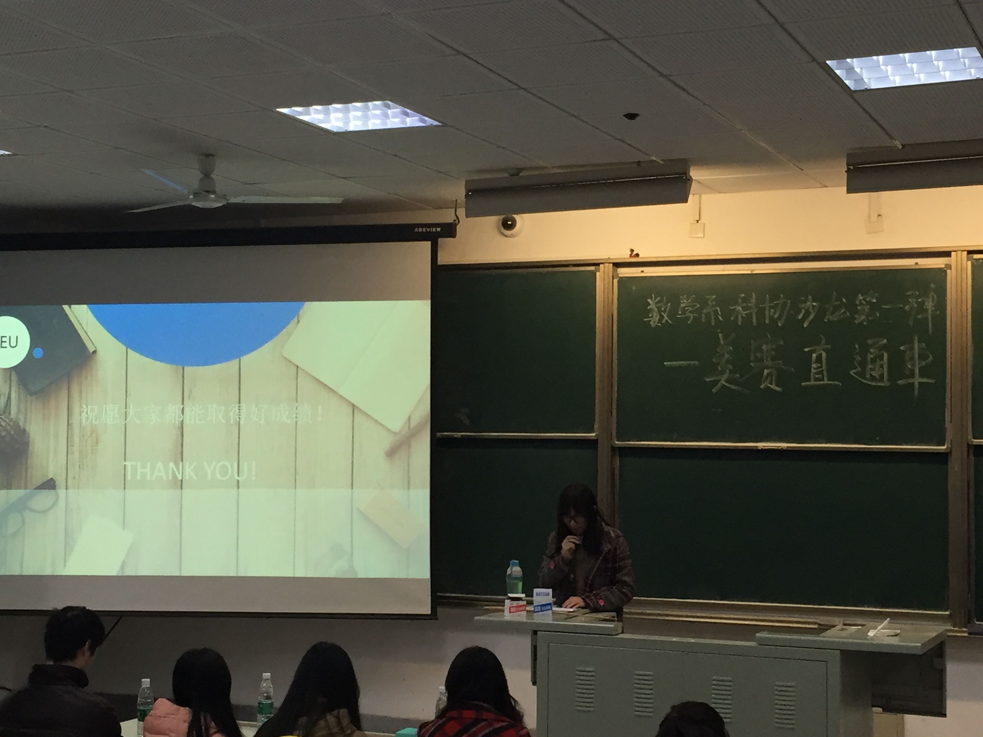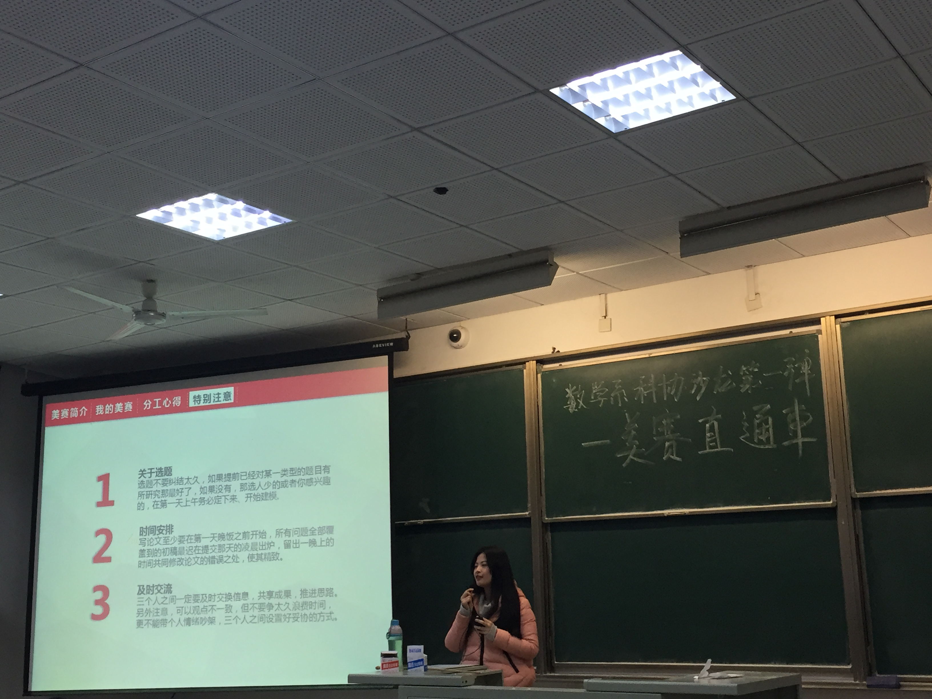 | 2015年12月23日中午,由数学系科技协会主办的沙龙第一弹――美赛直通车在教六-101成功举行,此次沙龙我们邀请到了在上届数模美赛中取得了优异成绩的学长和学姐们,为我们分享他们在比赛中的经验。 此次美赛沙龙由数学系科协科技竞赛部干事曾立云同学担任主持。交流会开始后,首先由在美国大学生数学建模竞赛中获得一等奖的,来自信息科学与工程学院的肖舒涛学长为我们分享了比赛中的一些技术性问题,其中包括,前期准备,比赛,以及论文写作。学长将比赛过程具体分为三个步骤:第一步:拆题,弄清题目问的是什么,问题是分几个层次,第二步:做题,第三步:改论文。与此同时,学长还就时间的分配和和参加完比赛后的收获,提出了个人的观点和看法。 接下来,同样来自信息科学与工程学院的高璇璇学姐,为我们详细的介绍了美国大学生数学建模竞赛的基本情况,并就比赛过程中如何分工合作分享了她的经验,学姐认为一定要认清自己的能力,如果你是三个人中的大牛,你可以及负责模型的建立也负责最后论文的写作,如果你感觉自己能力一般,一定要做最听话的人,负责完善小组讨论得到的成果。千万不要只提意见然后自己什么都不去做。除了分工合作,学姐还为我们分享了有关选题、时间安排、文献的查找和参考以及论文的写作等方面的经验。 紧接着,来自数学系的陈旋学姐,在论文写作方面为大家做了详细的讲解,在论文的写作过程中,各章节的划分、标题的拟定应体现文章清晰的思路;时间充足,尽量先写中文论文,再翻译;必须交代清楚所建模型、所用方法,论文中的亮点和新颖之处一定要在摘要中提及;一定要检查论文排版,表格和图形的大小、格式,使论文尽量美观。 最后,来自数学系的梁晓洁学姐在总结了前面几位学长学姐的发言后,重点提到了文献资料查找和阅读以及一篇论文摘要的重要性,并指出在前期训练过程中可以阅读往年的优秀论文,参考这些论文的写作方法和大体框架,为后期在比赛过程中的论文写作打下基础。 在学长学姐精彩的经验分享之后,最后的提问环节也将此次交流会推向了高潮,不论是提前在微信平台上留言提出的问题,还是到场同学踊跃的现场提问,学长学姐们都一一给出了细致的解答。 此次美赛沙龙,不仅为同学们分享了上届获奖同学的经验和感悟,同时也解答了部分即将参加比赛同学心中的疑惑,对今天到场的同学来说此次交流会无疑是一次重要的收获,最后也预祝即将参加美国大学生数学建模竞赛的同学可以获得优异的成绩! |
