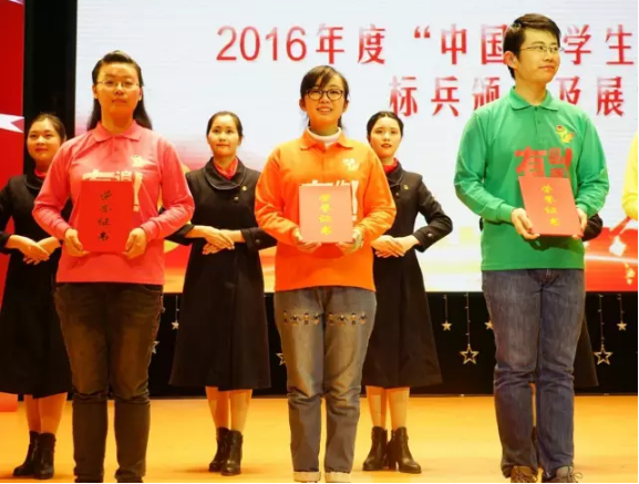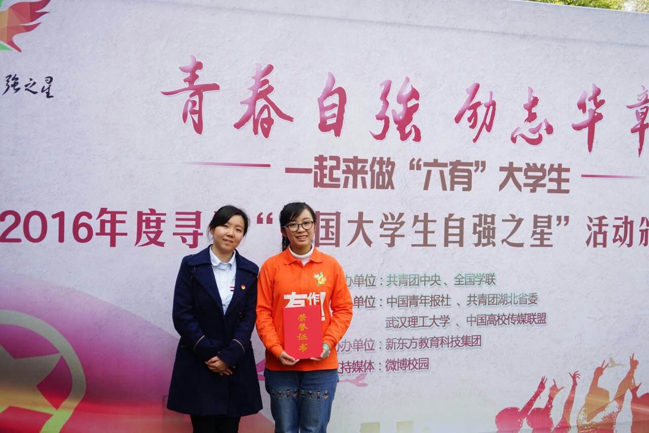 我院硕博连读研究生谷乐作为“2016中国大学生自强之星标兵”上台领奖。获得“2016中国大学生自强之星标兵”的还有:投身公益助农的裴锦泽,立志通过新材料改变世界的赵云龙,用笔尖探险的白玛德吉,为智能电单车提供中国动力的杜磊,给青春烙上迷彩底色的蒋光明,用奉献谱写英雄赞歌的肖玉玲,心怀感恩点燃创业梦的张文梅,不为环境所累逆风生长的孟祥波,为纺织行业贡献力量的袁小婷。团中央书记处书记傅振邦、新东方教育科技集团董事长俞敏洪、湖北省政府副秘书长聂昌斌为他们颁奖。