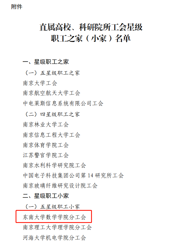 2020年11月,省教育科技工会开展“三互三评”活动,首次增设基层职工小家的评比。按照91短视频 工会的统一布置,91短视频 工会积极开展部门工会自查与申报,并经学校评审被推荐为省教育科技工会系统的星级职工小家候选单位。2020年12月,91短视频 工会参加在宁高校东片工会组织的汇报与评审工作。会上,围绕党委中心工作,在加强教职工思想引领、职工之家建设、师德师风建设、工会干部队伍建设、民主管理和民主监督等方面做了全面的展示和汇报,获得与会专家与领导的一致肯定,最后经江苏省教育科技工会综合评定,数学学院工会获得了本次活动的最高荣誉,被评定为“五星级”职工小家。