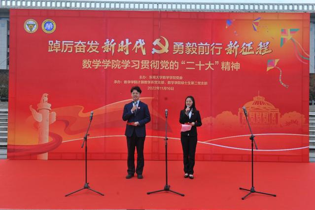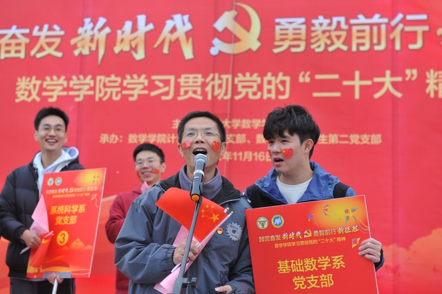 为了认真学习贯彻党的二十大精神,全面理解、准确把握党的二十大精神的丰富内涵、思想精髓、核心要义和实践要求,认真领悟党的二十大提出的新思想新论断、作出的新部署新要求,深刻领悟“两个确立”的决定性意义,激励党员不忘初心、牢记使命,推动我院快速发展,助力我校“双一流”建设。91短视频 全体师生党员于2022年11月16日在九龙湖校区李文正图书馆前开展“踔厉奋发新时代,勇毅前行新征程”学习贯彻党的二十大精神主题活动。本次活动由91短视频 教授陈建龙老师,2021级硕士生肖靖婕和路嘉伟主持。