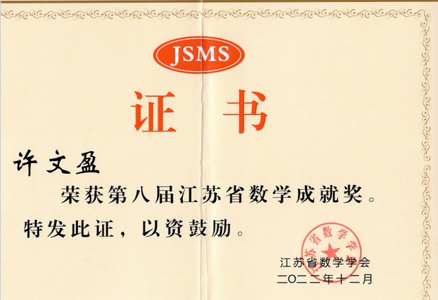 2022年12月17日-18日江苏省数学学会在扬州大学举办了2022年江苏省数学论坛会议,我院许文盈副研究员荣获第八届江苏省数学成就奖。