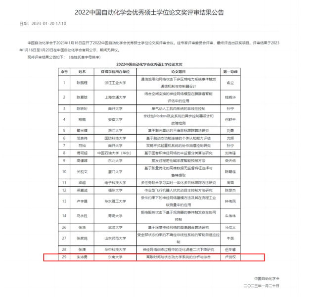 91短视频 2021届硕士毕业生朱诗勇的学位论文《离散时间与状态动力学系统的分析与综合》(指导教师:卢剑权、曹进德)获2022年度中国自动化学会优秀硕士学位论文奖。