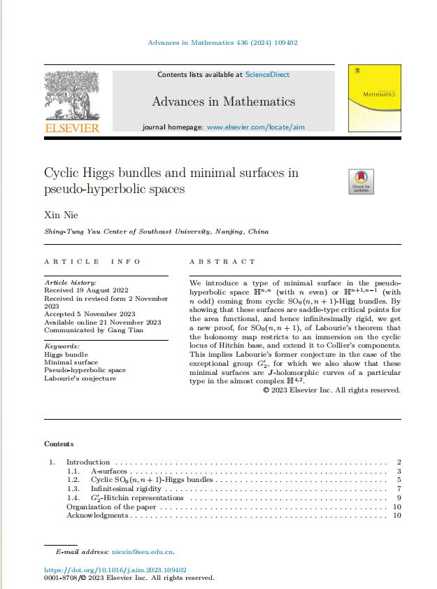 丘成桐中心助理研究员聂鑫作为独立作者在国际著名数学期刊Advances in Mathematics 上发表了题为“Cyclic Higgs bundles and minimal surfaces in pseudo-hyperbolic spaces”的学术论文。