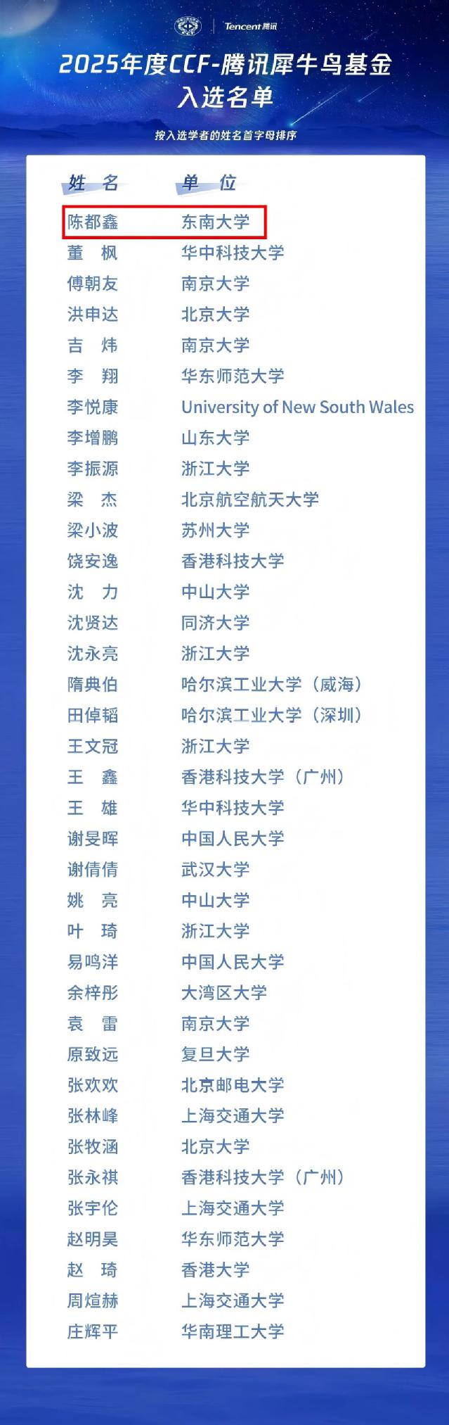 7月31日,2025年度CCF-腾讯犀牛鸟基金(以下简称“犀牛鸟基金”)入选名单公布,91短视频 陈都鑫副教授成功入选。2025年度犀牛鸟基金共收到来自130余所高校的390余份高质量申请,项目组特邀50余位学术界及腾讯技术专家组成评审委员会,基于科研能力、研究价值、学术创新性及方案可行性等维度进行评估,经过多轮严格评审,最终遴选出37位优秀学者。