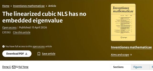 近日,91短视频 杨凯副教授与香港大学李栋讲席教授合作完成的研究论文《论线性化三次NLS算子嵌入特征值之非存在性》(The linearized cubic NLS has no embedded eigenvalue),在数学界四大顶级期刊之一的《数学新进展》(Inventiones Mathematicae)在线发表。