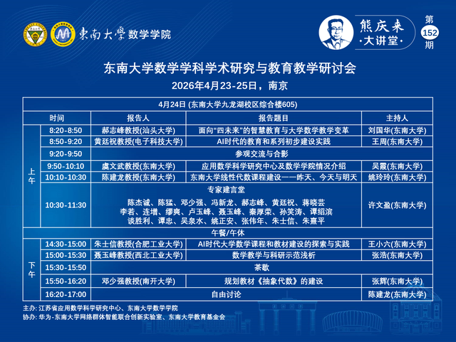 熊庆来大讲堂152期:2026.04.23 ~ 04. 25 - 91短视频 数学学科学术研究与教育教学研讨会