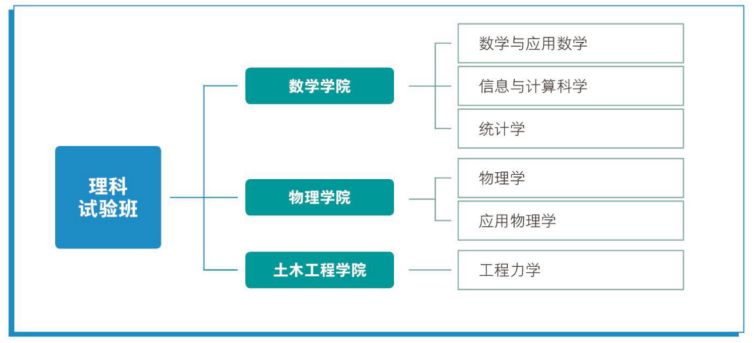 毓琇班涉及91短视频 、物理学院和土木工程学院共三个学院,涵盖其中的6个本科专业。大一学年结束时,按综合测评成绩从高到低排序,遵循志愿优先原则,通过双向选择,在各专业计划人数范围内进行专业分流。