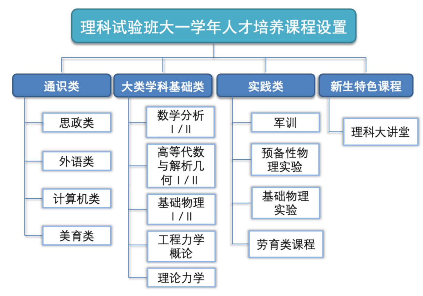 第一年以理科大类进行培养,为学生开设思政、美育、劳育、计算机、英语等通识课程,以及大类学科基础课程。全面落实“本科生导师制”,为每一位本科生配备学业导师,进行学业指导和科研引路。设立 “理科大讲堂”,邀请院士专家前来授课,从学术视野和人格情怀上全面锻造和炼就理学领军人才。